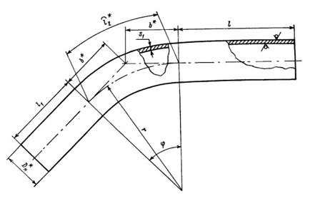 Пример условного обозначения гнутого отвода исполнения 058 с углом гиба j = 45° и радиусом R = 1370 мм из трубы наружным диаметром Dа = 273 мм, с толщиной стенки s = 50 мм, с прямыми участками длиной l = 800 мм, l1 = 650 мм и длиной развертки lp = 2526 мм: