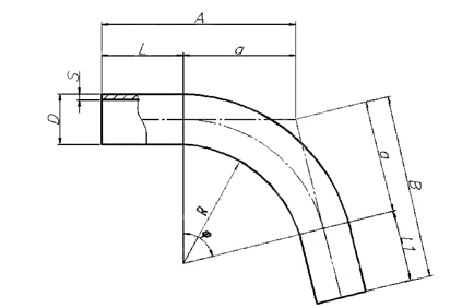 DN - Условный проход; D – наружный диаметр торцов отводов, мм; S - толщина стенки отвода на торцах диаметра D; Tв – толщина стенки отводов в неторцевых сечениях; R – радиус изгиба (радиус кривизны осевой линии), мм; φ – угол изгиба (угол поворота осевой линии), градус; L, L1 – прямые участки, мм; А, B – строительные длины, мм; а – строительная длина изогнутого участка, мм.