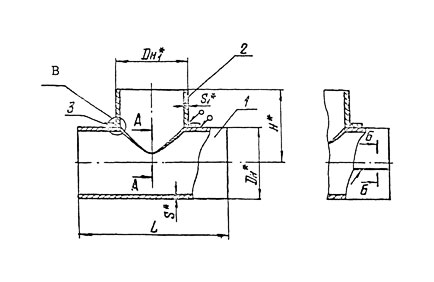 Конструкция и размеры сварных переходных тройников с накладками должны соответствовать указанным на чертеже 1 и в таблицах 2 и 3.